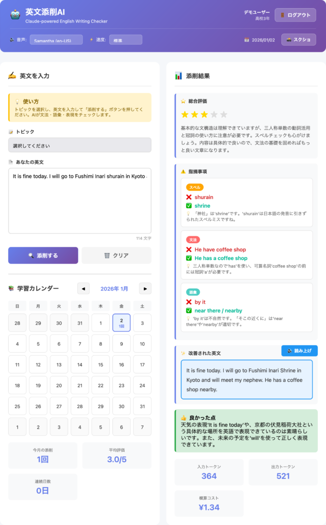 ② ユーザーが英文を入力すると、AIが添削と評価をしてくれる。