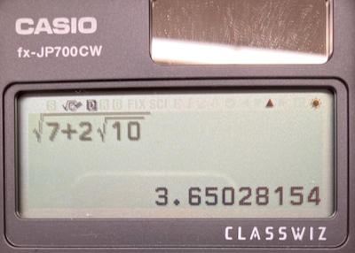 例えば、\( \sqrt{7+2\sqrt{10}} \; \)は、\(a^2-b^2 c=49-4\times 10=9\;\)となるので、2重根号は外れます。