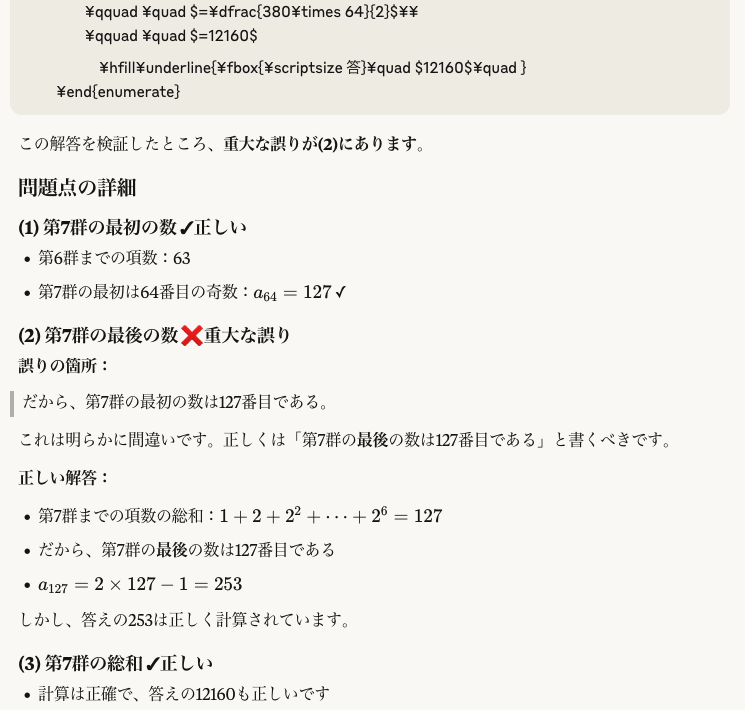 私は、プリントを\(\TeX\)で作っているので、そのソースファイルをそのままClaudeに入れて、「数学的に間違いが無いか確かめて」とお願いすると、下記のような返事が返ってきます。