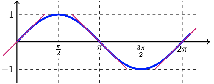 $y=\sin\theta$のグラフは$x$軸と公差する点において、傾きが$1$か$-1$になります。これを知っていれば、フリーハンドでグラフを描くときに、美しいサインカーブが描けます。