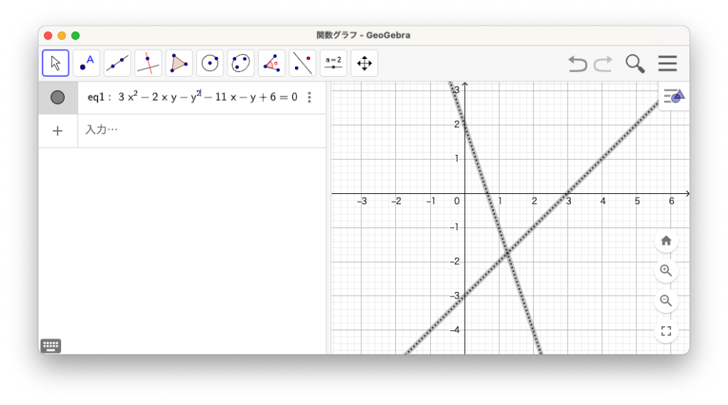 それでは、高校1年の因数分解の単元で、\(3x^2-2x y-y^2-11x-y+6=(3 x+ y-2)( x- y-3)\)のような因数分解の意味を生徒に伝えるためにはどうしたら良いかを考えていて、因数分解する理由は方程式を解くことであるから、方程式\( 3x^2-2x y-y^2-11x-y+6=0 \)をグラフ化することを思いつきました。MathematicaのImplicitPlotという関数で描けることは知っていましたが、生徒に自ら描かせることができないかとGeoGebraでやってみたところ、なんと陰関数のグラフをGeoGebraは見事に描いてくれました。